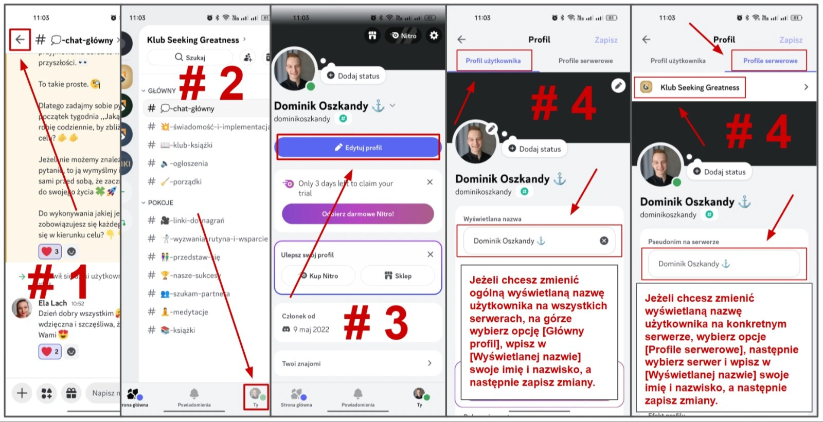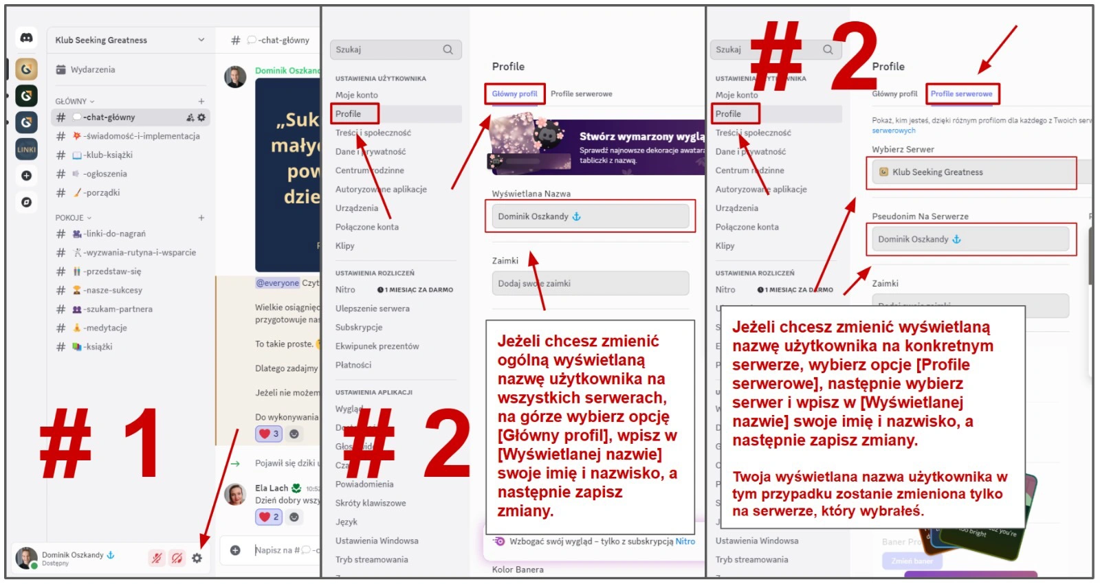 Drugim sposobem jest zmiana wyświetlanej nazwy użytkownika tylko na wybranym serwerze. Żeby to zrobić, musisz wcześniej dołączyć do konkretnego serwera discord, a następnie w trakcie zmieniania nazwy użytkownika wybrać opcję u góry [Profile serwerowe], następnie wybierasz serwer, na którym chcesz zmienić wyświetlaną nazwę i poniżej zmieniasz wyświetlaną nazwę użytkownika na pełne imię i nazwisko, ale tylko i wyłącznie na serwerze, który wybrałaś.